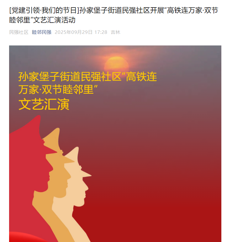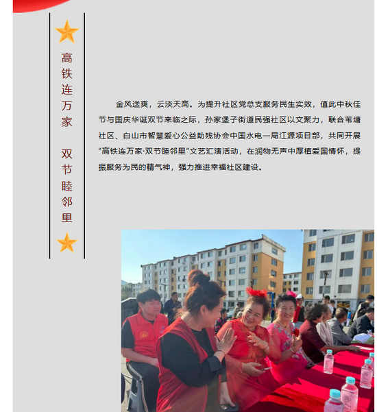 金風(fēng)送爽,云淡天高。為提升社區(qū)黨總支服務(wù)民生實(shí)效,值此中秋佳節(jié)與國(guó)慶華誕雙節(jié)來(lái)臨之際,孫家堡子街道民強(qiáng)社區(qū)以文聚力,聯(lián)合葦塘社區(qū)、白山市智慧愛(ài)心公益助殘協(xié)會(huì)、中國(guó)水電一局江源項(xiàng)目部,共同開(kāi)展“高鐵連萬(wàn)家·雙節(jié)睦鄰里”文藝匯演活動(dòng),在潤(rùn)物無(wú)聲中厚植愛(ài)國(guó)情懷,提振服務(wù)為民的精氣神,強(qiáng)力推進(jìn)幸福社區(qū)建設(shè)。 https://mp.weixin.qq.com/s/sjHtZIve9EB6dRZ6oCb1Gw |
